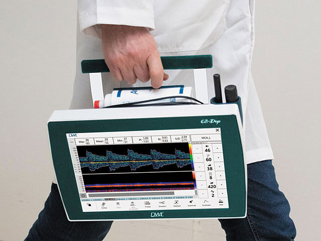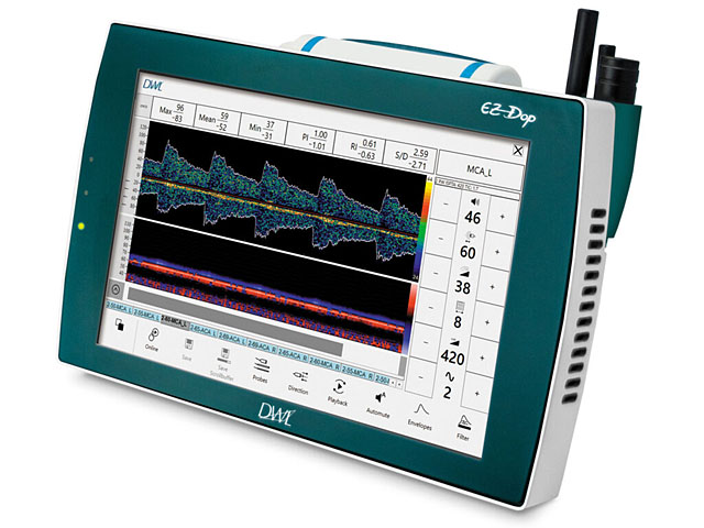 Digitální DWL® Dopplerovské zařízení s rutinním softwarem včetně Doppler M-Mode, dotykové obrazovky, držáku sond, napájecího kabelu, držáku na gelovou lahvičku.